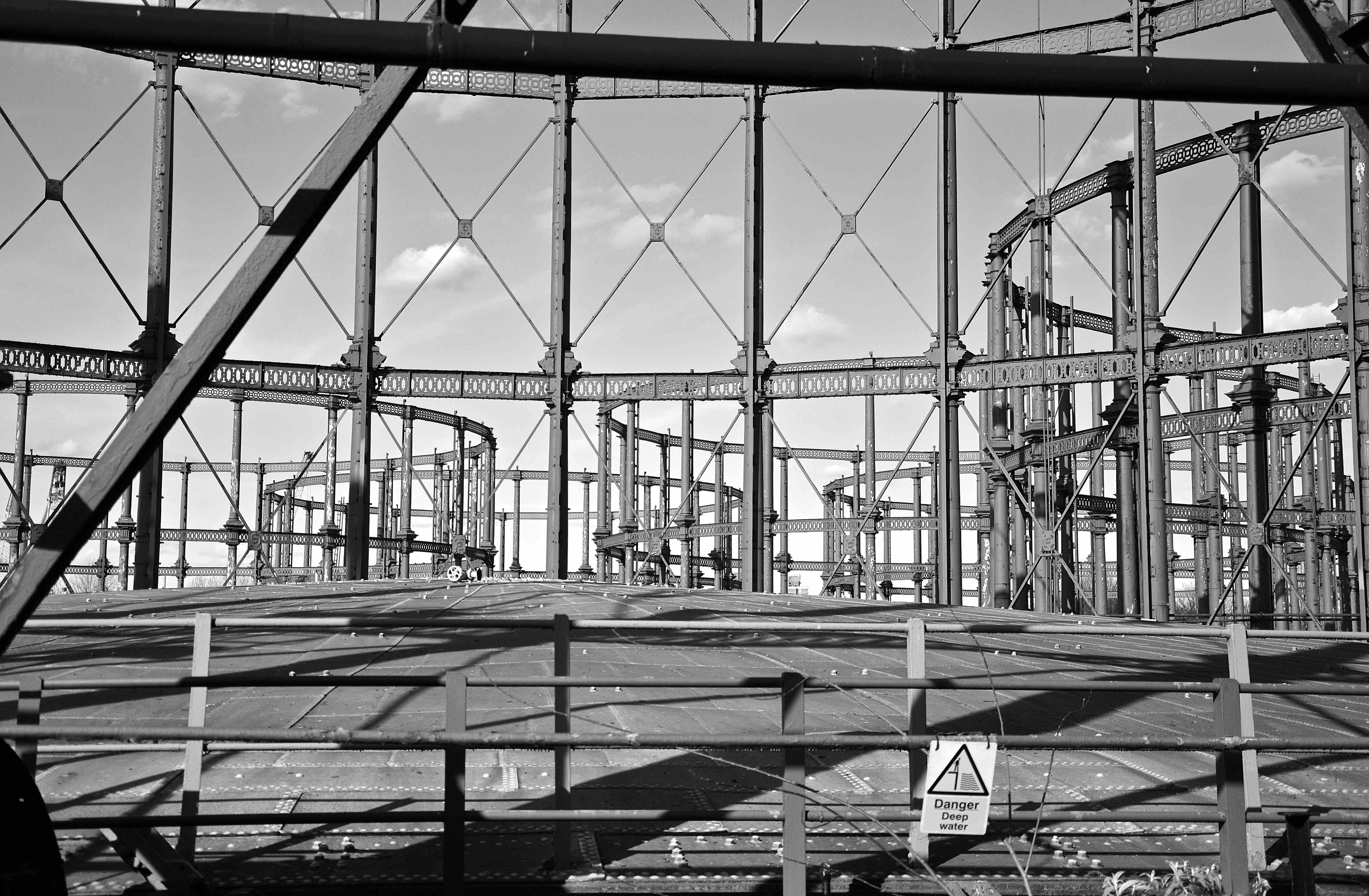 London offers a wide variety of architecture, but the structures that most fascinated me, are gas holders, also known as gasometers. These enormous structures, born in the Victorian age, used to provide the city with coal gas, or town gas, that was stored in steel cylinder cans inside them.They have been dismissed as natural gas was discovered in the northern sea in 1965 and advancements were made in pipelines transportation. Gas holders are threatened by demolition for many reasons and there is great polemics about them. They occupy large areas in zones where cost of properties is rapidly increasing. Furthermore companies owning them, National Grid for at least 500 in the UK, are not properties companies, and selling the fields could be an opportunity for builders and developers.